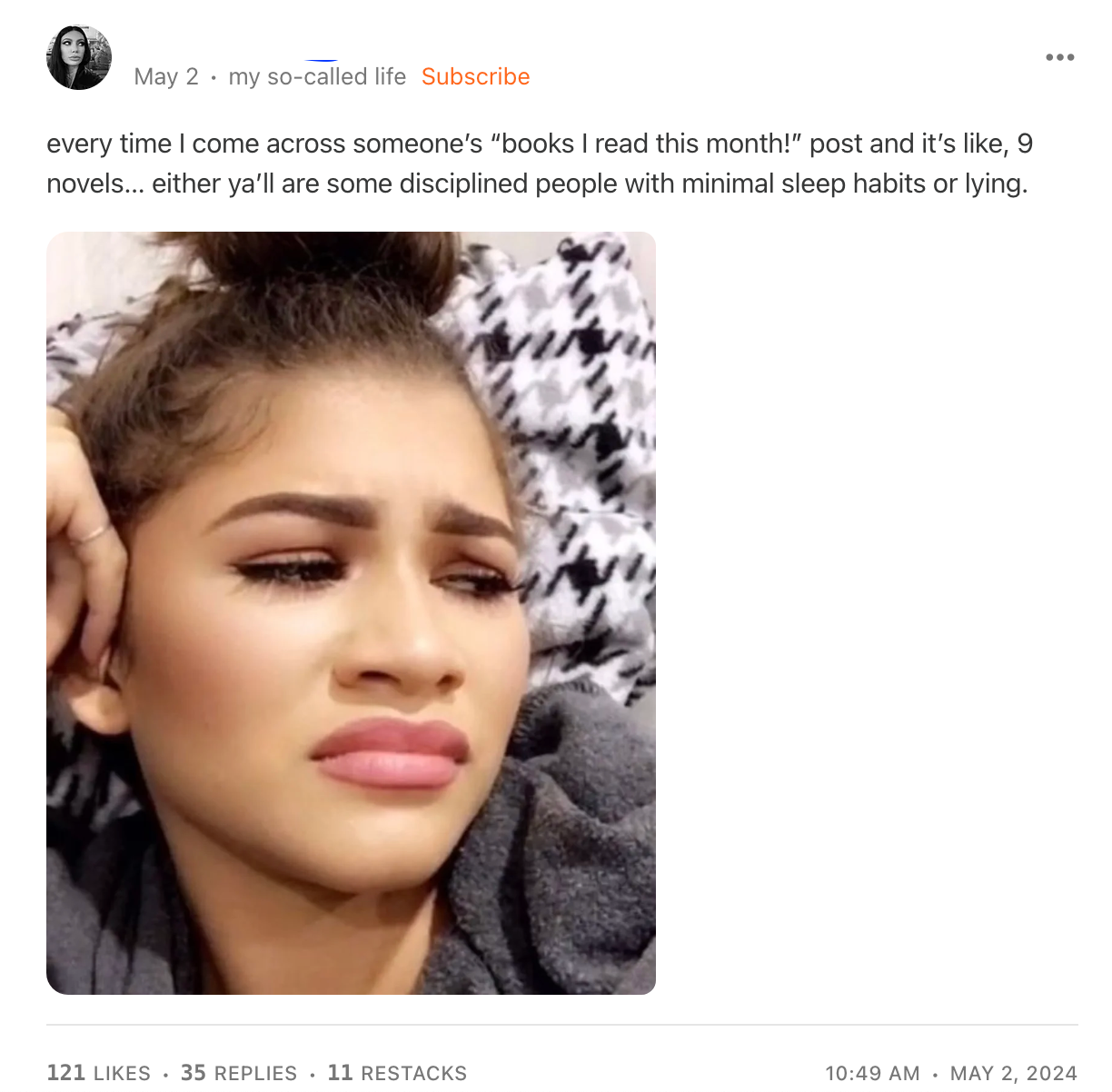 To respond to the offending Note more directly—I read about 9 novels a month, I’m not lying about this. I have way too much gratitude for the autonomy I have over my own time for that.7 And I sleep 7-8 hours a night. I simply don’t scroll on Instagram or TikTok very often (anymore). And now, I will probably also limit my time reading Substack Notes and delete the Substack app off my phone.